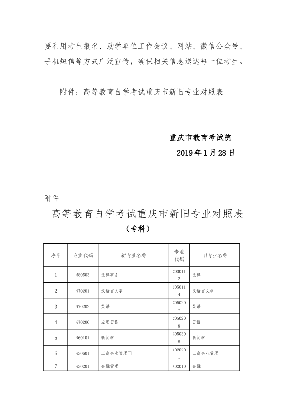《关于更新自学考试开考专业代码及名称的通知》 (渝教考发〔2019〕9号)